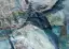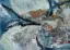 Dunkel-gestische Schwünge in Petrolblau über geschichtetem, hellem Blaugrau, mit durchscheinenden Collageflächen und vereinzelten Rost- und Rottönen, kühl und bewegt wie Eis oder Geäst.