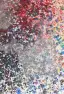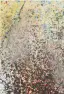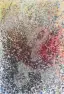 Dichte Sprühtechnik-Komposition mit baumartiger Silhouette, aufgebaut aus unzähligen feinen Farbspritzern in Rot, Schwarz, Blau, Grün und Gelb auf hellem Grund, mit vibrierender, herbstlich-floraler Wirkung.