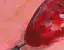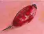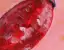 Diagonal liegende, tiefrote Hagebutte mit weißen Glanzlichtern auf zartrosa-pfirsichfarbenem Grund, weich gemalte Oberfläche in warmer, stiller Stimmung.