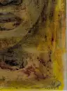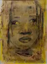 Frontales Gesicht in Ocker- und Gelbtönen mit dunklen Kohle-Konturen, auf texturiertem Grund aufgetragen, mit ruhigem, leicht melancholischem Ausdruck, datiert 2023.