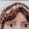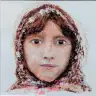 Kindliches Gesicht mit großen dunklen Augen und braunem Kopftuch, in pastosem Ölkreide-Auftrag auf hellem Grund mit rosa Akzent am Kragen, eindringlicher Blick.