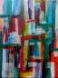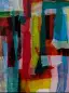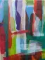 Vertikale, gitterartige Collage aus halbtransparenten Seidenpapierstreifen in kräftigem Rot, Türkis, Hellblau, Rosa und Gelbgrün, rhythmisch übereinander geschichtet.